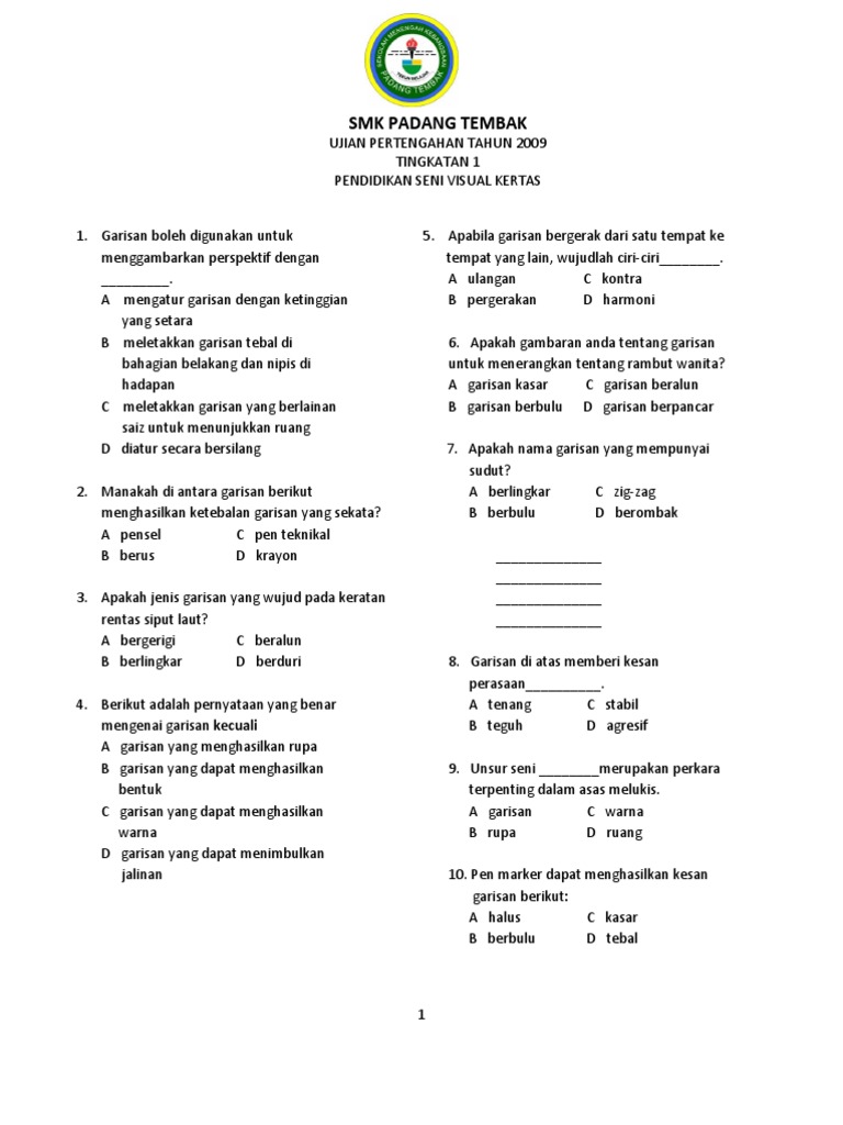Soalan pendidikan seni tingkatan 2 tajuk reka bentuk landskap kssm reka bentuk landskap tingkatan 2 by joe lozzoll on scribd. Tajuk rupa tingkatan 1 jawab semua soalan. 83%(6)83% found this document useful (6 votes). Soalan objektif jawab semua soalan 1. Sekolah menengah kebangsaan parit bunga.